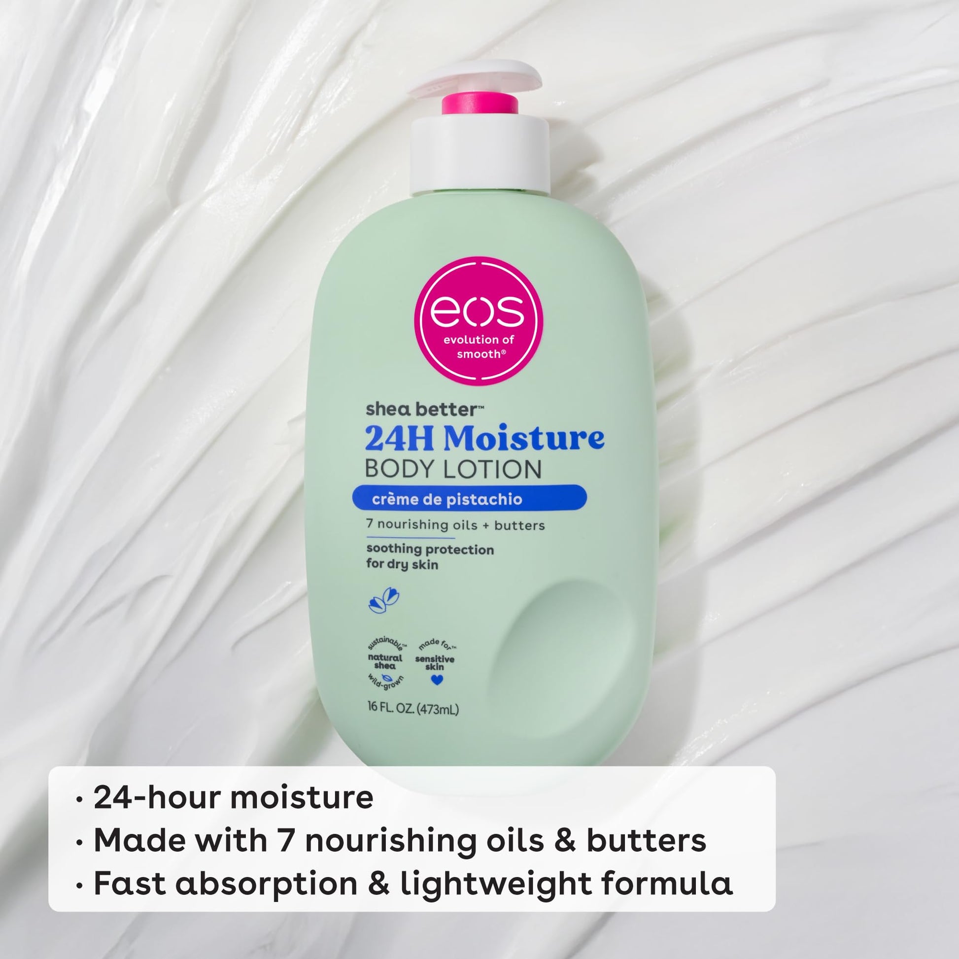 Details: eos 24H body lotion with instantly moisturizing Shea Oil + lasting protection Shea Butter quickly absorbs for 24-hour hydration. Say hello to… fast-absorption, lightweight, soft skin, and sustainable shea. Say goodbye to… greasiness, heaviness, and sticky residue.